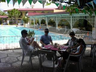 Miss Lee (歯列矯正中ってことは若い?) 思いのほかガッツリと ローカルテイストな食事を食べました (昨夜の酒は残ってなかったようです) 市内観光への集合場所は、モンテベリオのロビー マクタン宿泊組みの到着をのんびりと待ちます。 なかなか、仲間が起きてこない。まぁ昨夜の就寝時間を考えれば当然かぁ と思いつつも朝食 食べる時間なくなるよーっ と心配になり、 携帯でモーニングコール(海外初使用!) プールサイドに集合しての朝にひとときを過ごし、 集合時間を向かえた。
