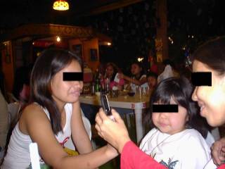 でっ、音はなんだったかと言うと、花火でした。 店の裏手での打ち上げ花火をあげていた音でした。 (なんか音が日本と違うですよね 事件じゃなくて よかった よかった) 渋滞につかまっていた仲間も到着。 まもなく在住の方が奥様と供に御出座!! (アダナ名が、「セブの御家老」で、時代劇調に) まずは、手を洗い食事会開始!! あまり冷えていないサンミゲールで乾杯! 食事に歓談にと楽しい時間を過ごすことができました。 バーベキューチキン(丸々一羽 頭はないけど首はある)最高でした。 イカの鉄板焼き(丸焼き?)のソースがご飯にぴったりで大変美味しゅうございました。 フィリピンの人って、やさしい人多いんだなぁ なんて感動!! (TT) 言葉の壁を乗り越えて、あやしてくれてました。