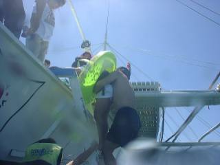 お約束のロビー集合 事前に手配しておいた船よりもお安いのがあったので、急遽キャンセルし、手配変え。 まぁ、キャンセルでちょいと誤解があったのですが、大きなトラブルにはならず一安心。 サンクチュアリ周辺で、スノーケリング。 ジェットスキーをとの希望者がいたので、その場で交渉してレンタル。 (船のそばに営業に来る来る。 漁師さんもアワビ? などと声かけてきます。) しかし、ジェットスキーから、自分たちの船を見つけるのは難しいようです。 同じような船がうじゃうじゃいますから、目印になるものを決めておかないと迷子になりそうです。 どこぞの島に上陸してバーベキューと、 当初は計画していたのですが、時間がもったいないと 船上でバーベキュー。 イヤー 美味しかった。 (^^) サンミゲルとバーベキューに暑い日ざしと碧い海 もう、言うことなし。 仲間のお子さん(内輪のアイドル)最初は海を怖がっていましたが、浮き輪につかまり楽しそうに 遊んでいました。(エビマヨV 4人がかりで膨らましました)